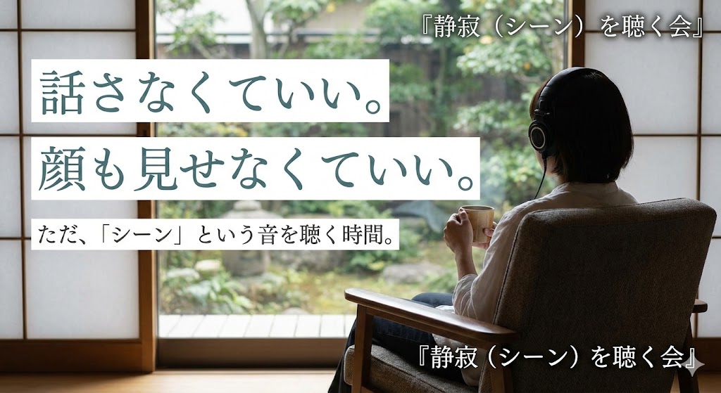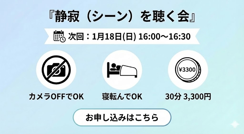 日曜日の午後、言葉も気遣いもいらない「脳の避難所」私が提供する**「明鏡止水・静寂(シーン)を聴く会」**は、悩み相談ではありません。 気功や瞑想のような、難しいワークでもありません。