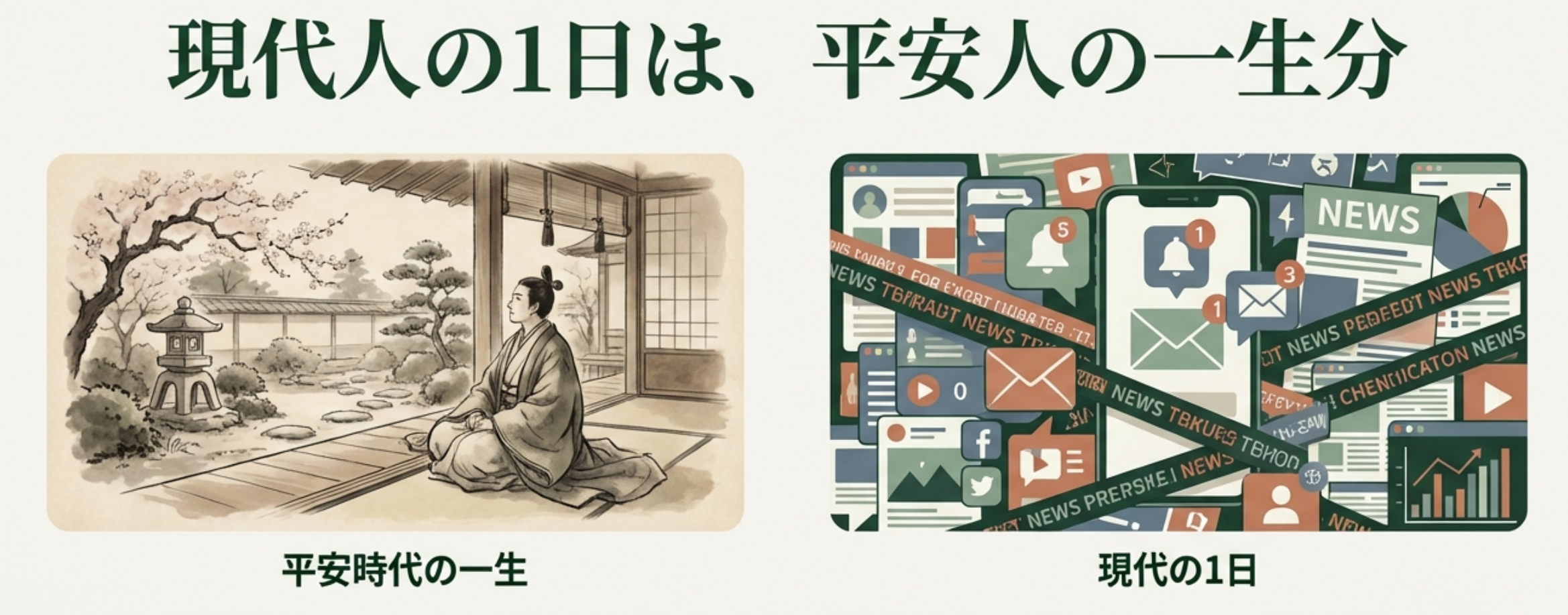 平安時代の情報(噂話やニュース)は「徒歩」のスピードで届きましたが、現代は「光」の速さで世界中の悲劇やトラブルが届きます。