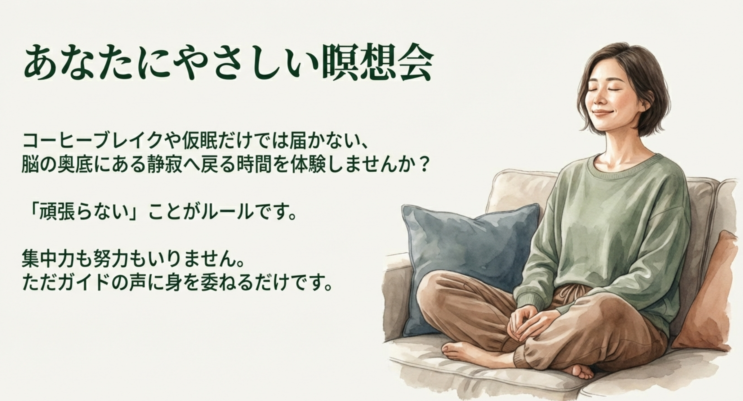 コーヒーブレイクや仮眠だけでは届かない、脳の奥底にある「静寂(インナーサイレンス)」へ戻る時間を体験してみませんか?